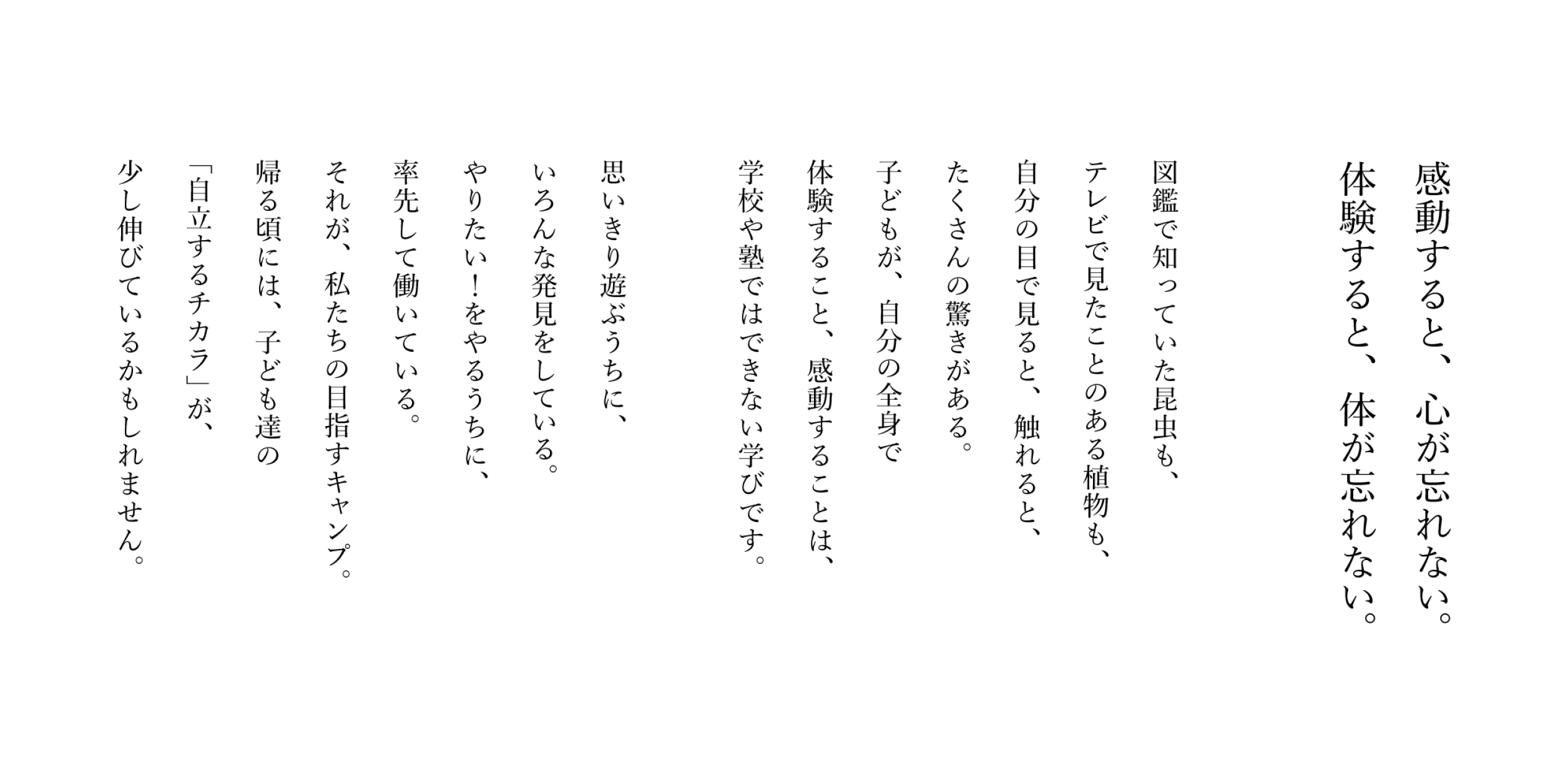 河合塾グループ様が2020年にオープンしたキャンプ場「CAMP MANAVIS(キャンプ マナビス)」の新規オープンに伴うトータルブランディングをnudoが担当しました。ロゴ制作、コンセプトコピー開発、WEBサイト設計・デザイン、撮影、グラフィック制作、実装まで一貫してサポートしています。「CAMP MANAVIS」の学びのコンセプトは「自立」。河合塾マナビス様の教育理念を反映し、子どもたちの自立を促すプログラムを提供。海での体験や磯遊び、裏山でのアクティビティなど、海と山の自然を活かしたユニークな体験が特徴です。Webサイトや各種ブランドタッチポイントの制作では、この「自立」という教育コンセプトとキャンプ場の独自性を的確に伝えることを重視。オープン時のブランディング施策として、一貫したブランド価値の構築と明確なメッセージを打ち出しました。