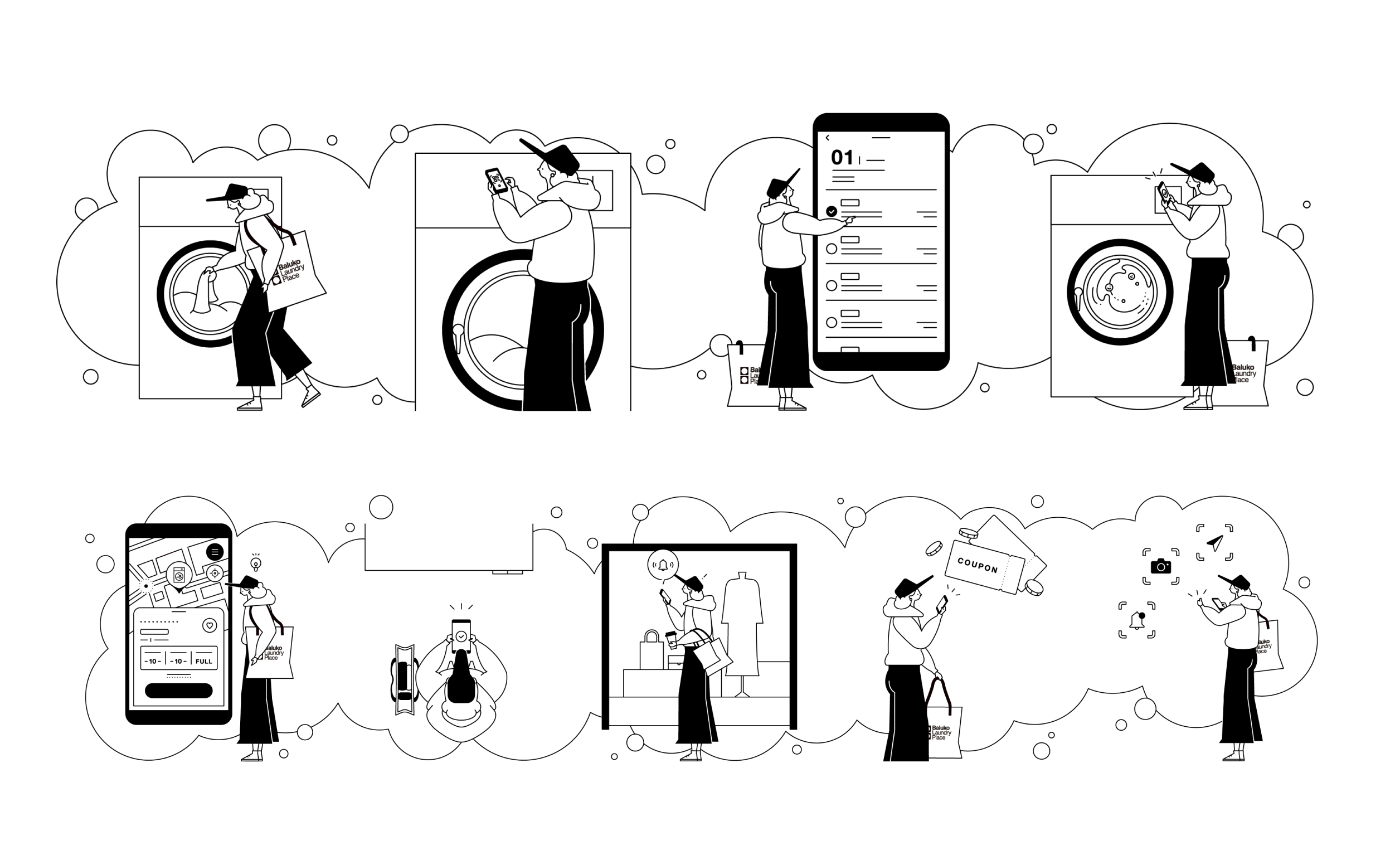 新しいランドリー文化創造を掲げるコインランドリー「Baluko Laundry Place」モバイルアプリの企画構成、UX設計からUIデザイン、イラストレーションまでを担当。ブランディング視点を軸に、クライアントと丁寧に協議しながら、制作を行いました。マップで近くにあるコインランドリーの稼働状況を把握、予約でき、店頭ではアプリの起動ボタンをタップするだけで洗濯がスタート。洗濯と通信を融合させ、新しいランドリー体験を形にしています。